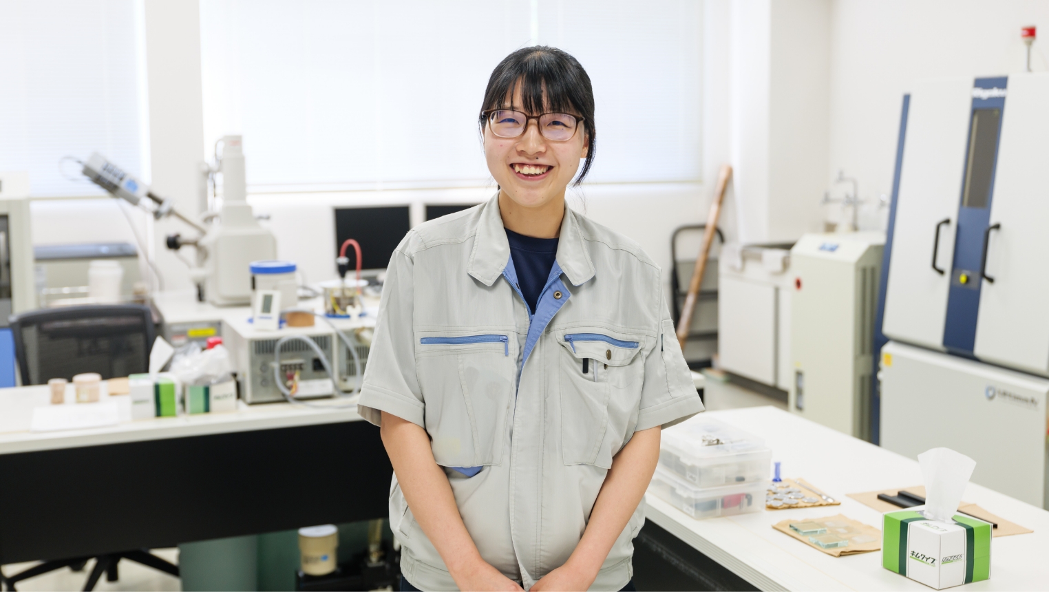 現在は品質管理部で分析業務を中心に行なっています。分析の対象となるのは粉状の物質やそれを固めたものなど。それらの表面の状態を電子顕微鏡で測定したり、含まれている金属などの成分が規格に合っているか調べたり、といった作業です。様々な測定項目があるので、一つひとつを細かく丁寧にチェックしていきます。